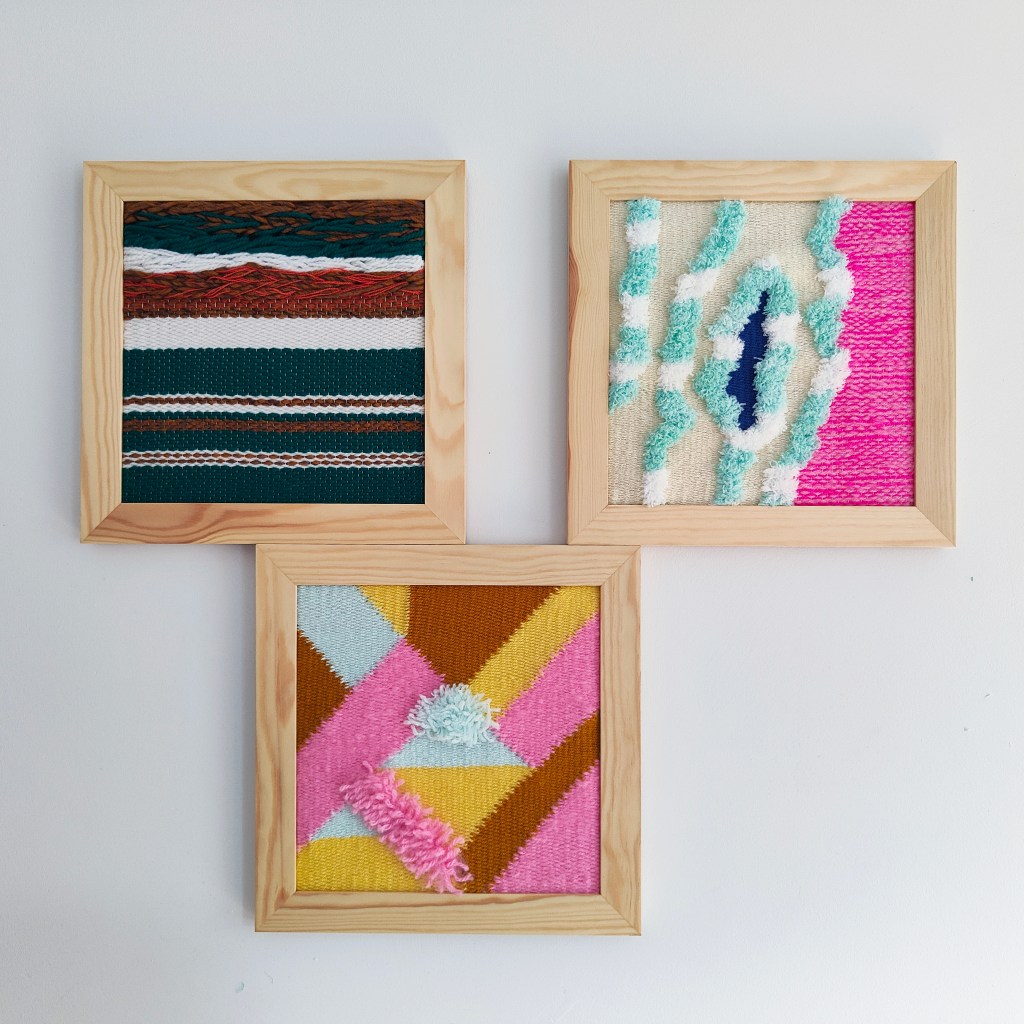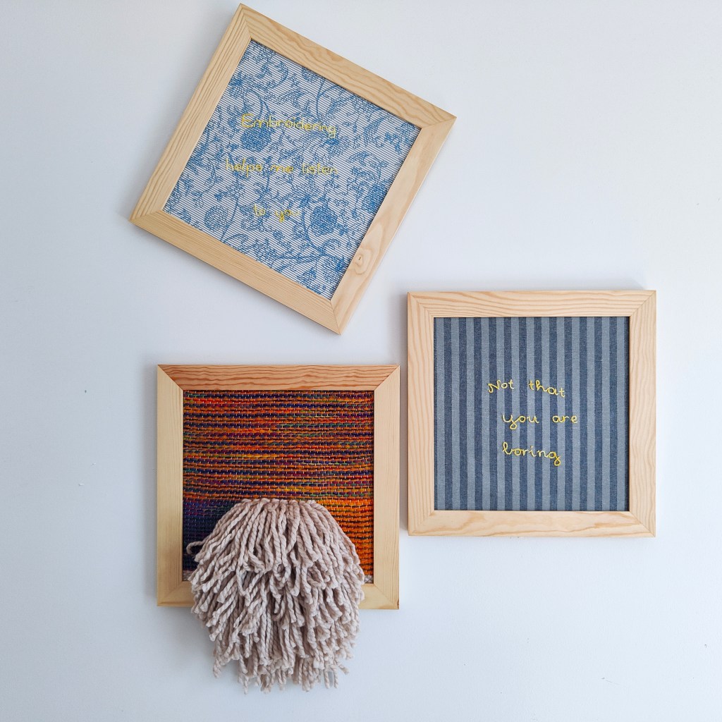 This work consists of several weavings and embroideries and emerged from the desire to reform my art practice and create a sustainable routine of self-pedagogy. The weavings follow a strict methodology: every idea should be carried out right away or be forgotten for good. This way, ideas are not carried over, and every time I sit in front of the weaving loom, I can start fresh, giving chance to the material to guide the process and my thoughts with it.